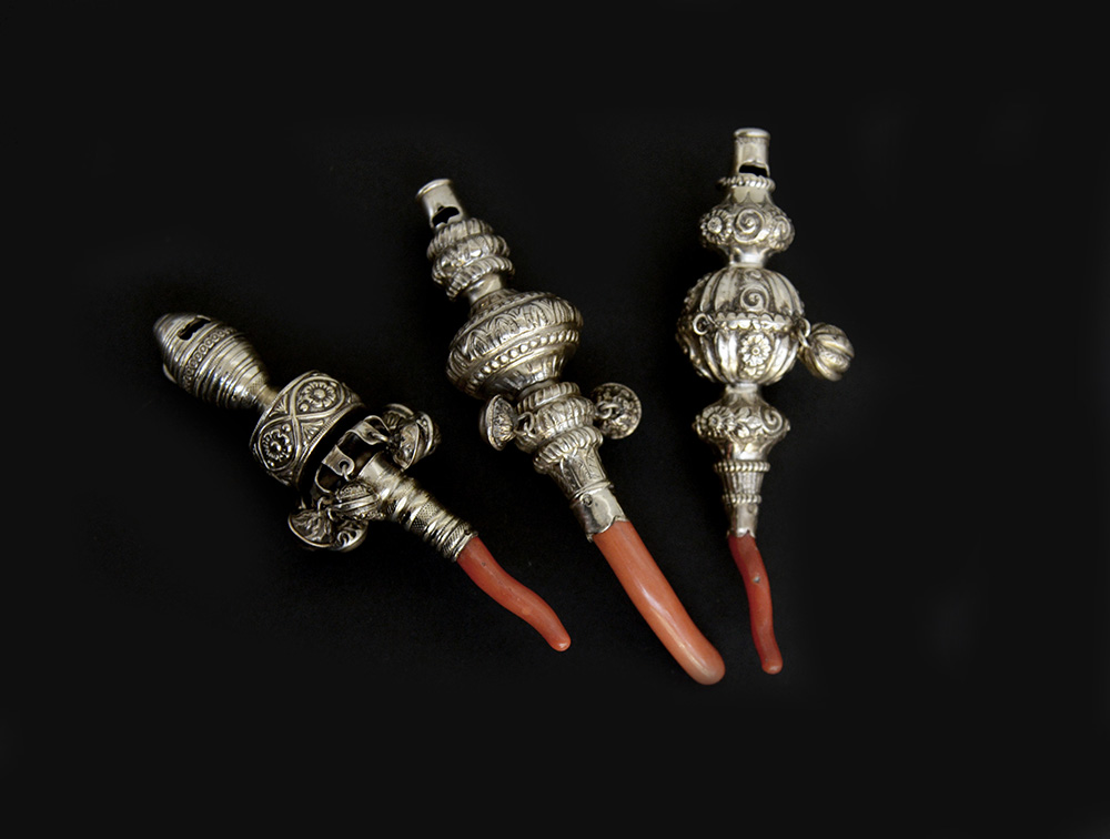 Gruppo di tre sonagli per bambini con fischietti in argento sbalzato a fiori, motivi vegetali e decorato a pendagli. Prese in corallo. Inghilterra, secolo XIX (difetti e mancanze)