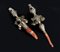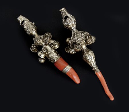 Due sonagli per bambini in argento sbalzato a fiori e motivi vegetali. Uno con dedica incisa. Prese in corallo. Secolo XIX (difetti)