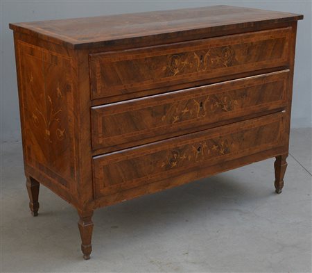 Comò lastronato in noce a tre cassetti filettati e intarsiati a motivi floreali. Lombardia, fine secolo XVIII (cm 119x88x56) (difetti e restauri)
