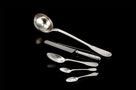 A part of silver flatware service composed of twenty-six spoons, fourty-three tablespoon, twenty-five knieves and a ladle. In a wooden cas (g tot 7400 ca.) (defects)