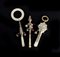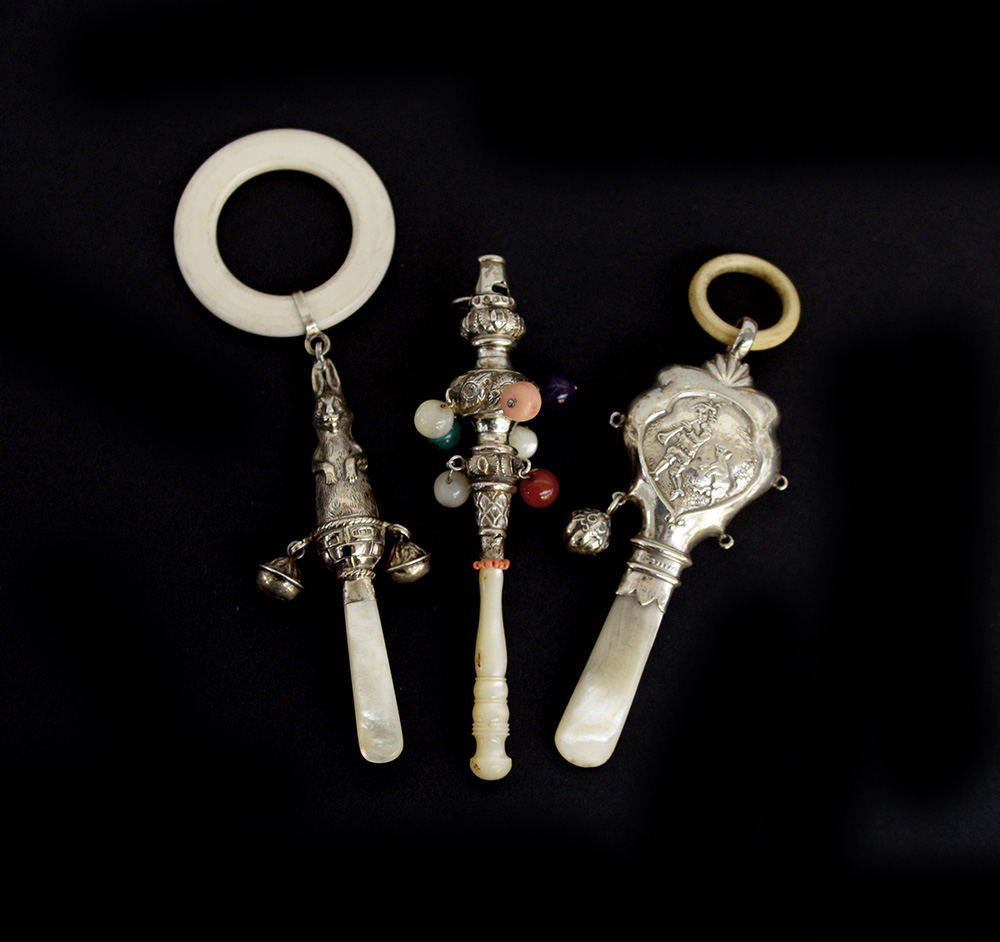 Gruppo di tre sonagli da bambino in argento, osso e madreperla decorati con...