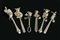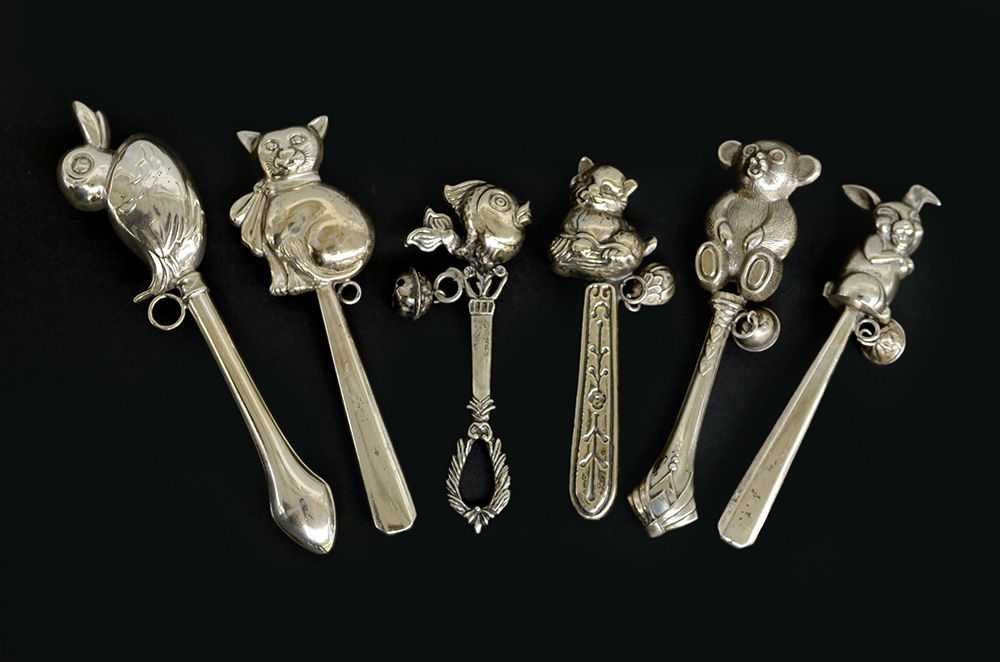 Gruppo di sei sonagli per bambini in argento decorati a tutto tondo ad animali (lievi difetti)