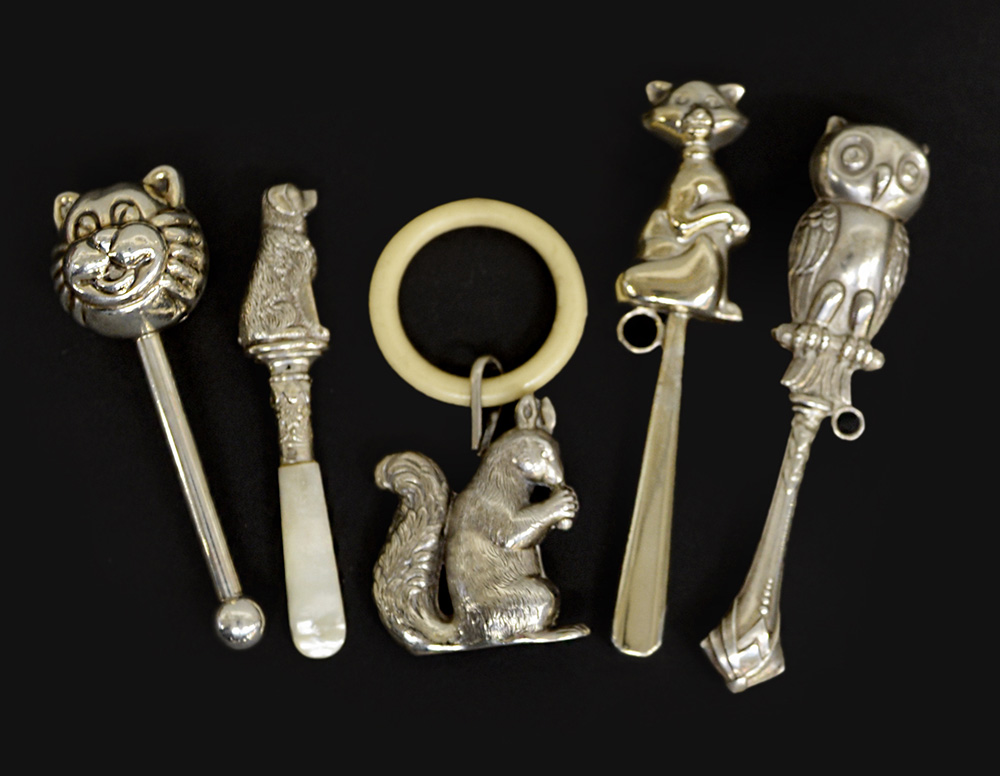 Gruppo di cinque sonagli in argento figurati ad animali, uno con presa in madreperla. Epoche diverse