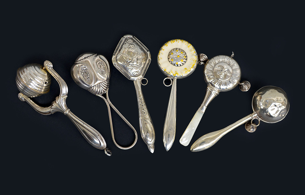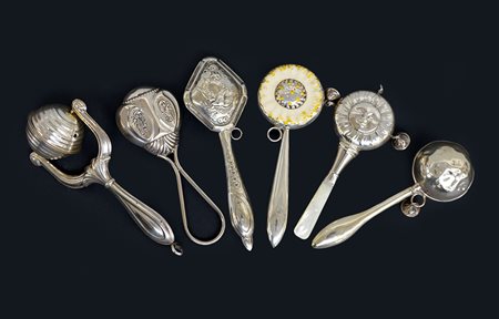 Gruppo di sei sonagli in argento, uno smaltato in policromia. Epoche diverse (lievi difetti)