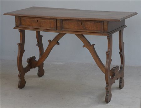 Antico scrittoio "fratino" in noce con due cassetti nella fascia e sostegni a lira (cm 126x82x56) (difetti e restauri)
