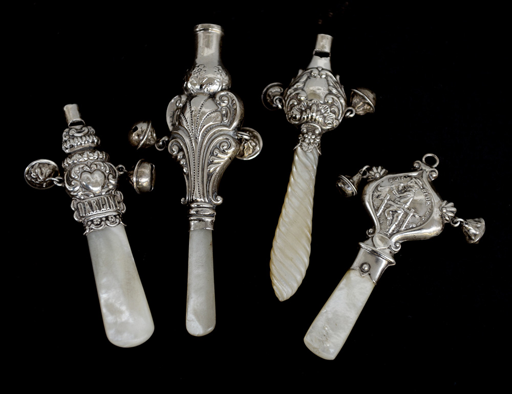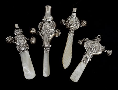 Quattro sonagli in argento sbalzato con prese in madreperla, due con fischietto. Inizio del secolo XX
