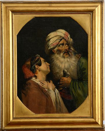Maestro europeo del XIX Secolo "Giorgio Rhodios in atto di uccidere la moglie Demetra" olio su tela (cm 59x44) In cornice