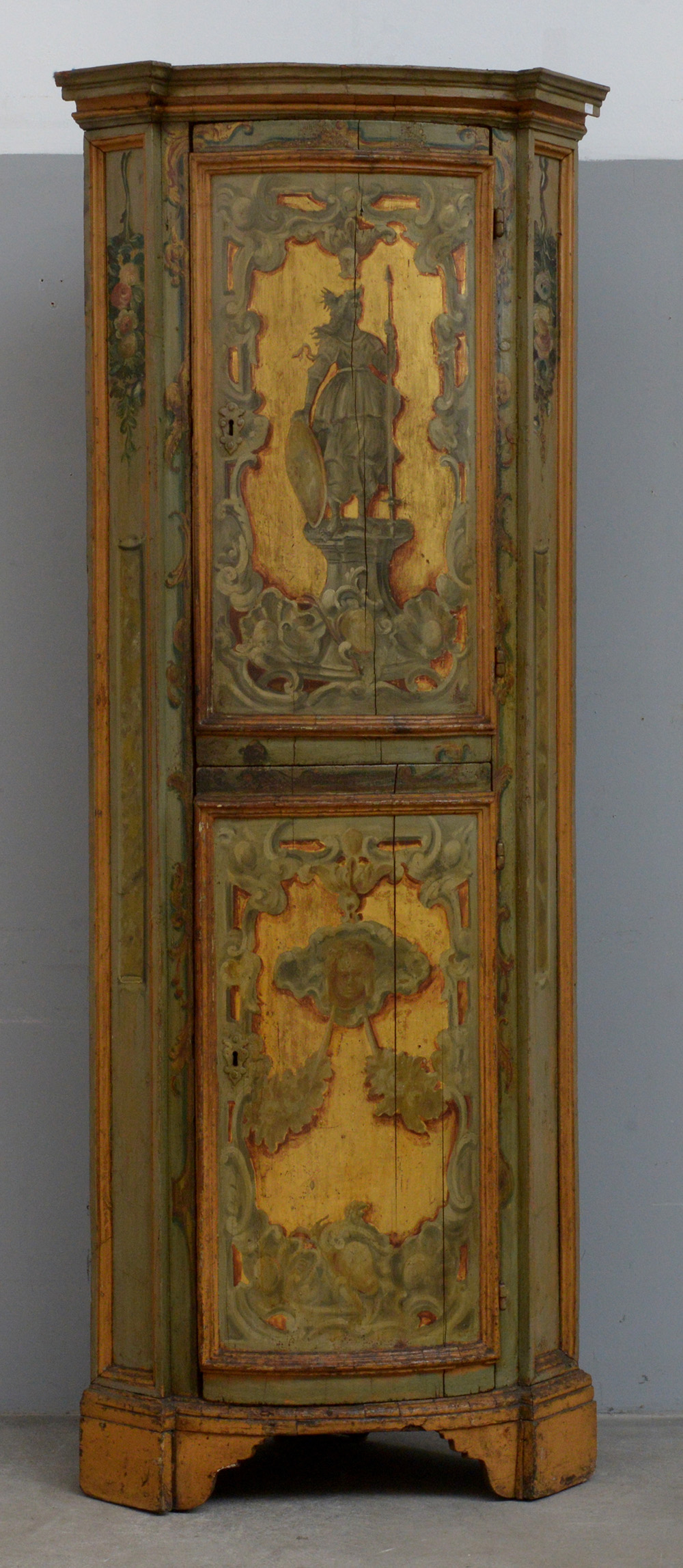 Angoliera a due sportelli sovrapposti con fronte convessa in legno dipinto, decorata con fiori, volute ed elementi figurativi (cm 84x212x57) (difetti)