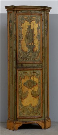 Angoliera a due sportelli sovrapposti con fronte convessa in legno dipinto,...