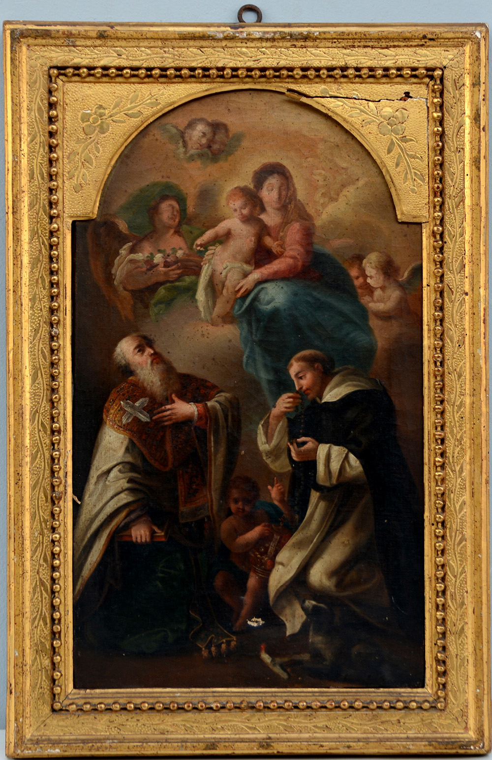 Scuola della fine del secolo XVIII "Vergine in gloria con Bambino e santi" Olio su tela (cm 48,5x28,2) In cornice coeva in legno dorato e bulinato (difetti)