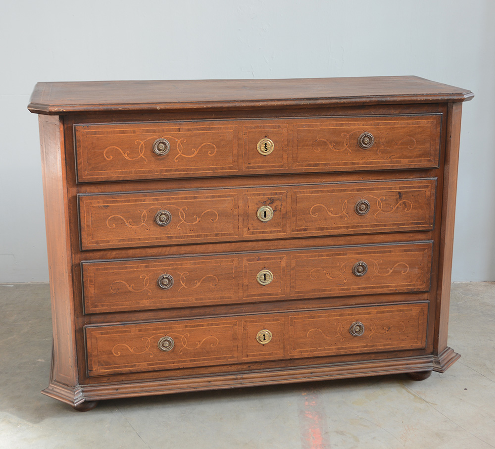 Comò a quattro cassetti con fronte, fianchi e coperchio filettati e intarsiati a volute in legno chiaro. Piemonte, secolo XVIII (cm 140x100x55) (difetti)