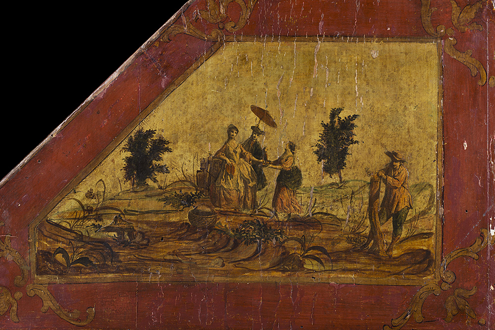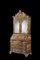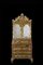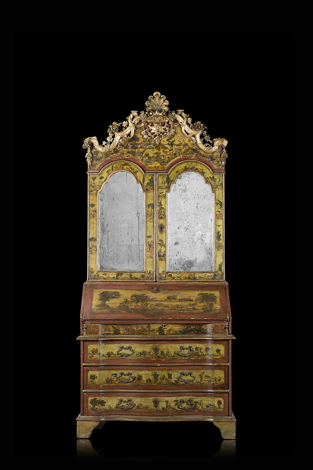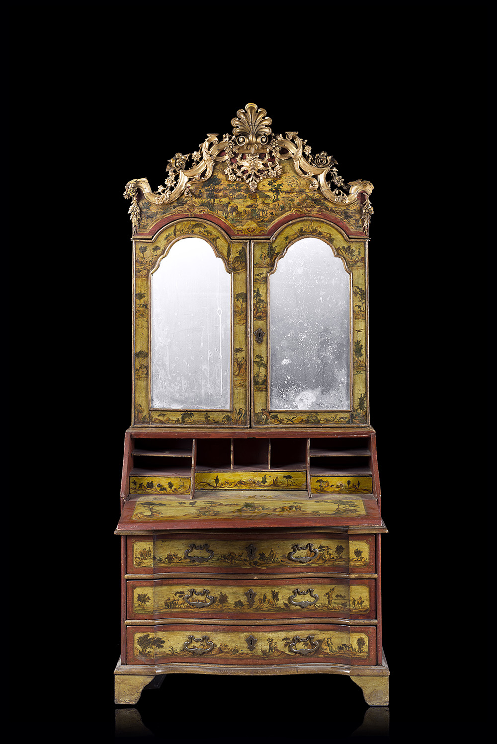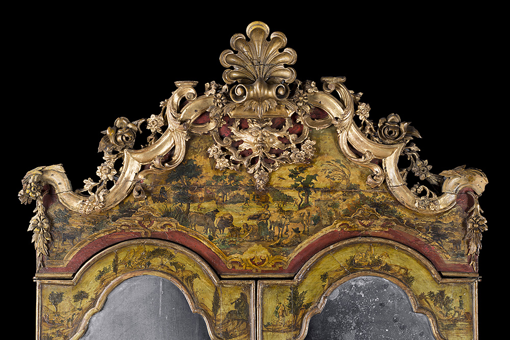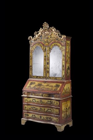 Trumeau "ad arte povera" con parte superiore a due ante a specchi con cimasa decorata e intagliata a fiori e mascheroni. Parte inferiore di forma mossa a tre cassetti con anta ribaltabile celante vani, cassettini e segreto. Veneto, secolo XVIII (cm 110x236x54) (difetti)