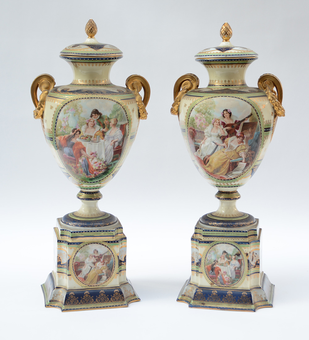 Manifattura di Vienna. Coppia di vasi biansati con coperchio in porcellana policroma decorati a fregi dorati e riserve con raffigurate scene di vita all'aperto. Basi a plinto, fine sec. XIX (h cm 54) (lievi difetti)