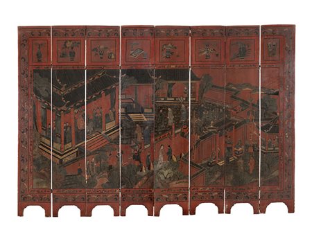 Paravento ad otto ante con decoro dipinto su fondo in lacca cinabro (difetti e mancanze)