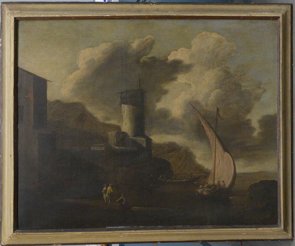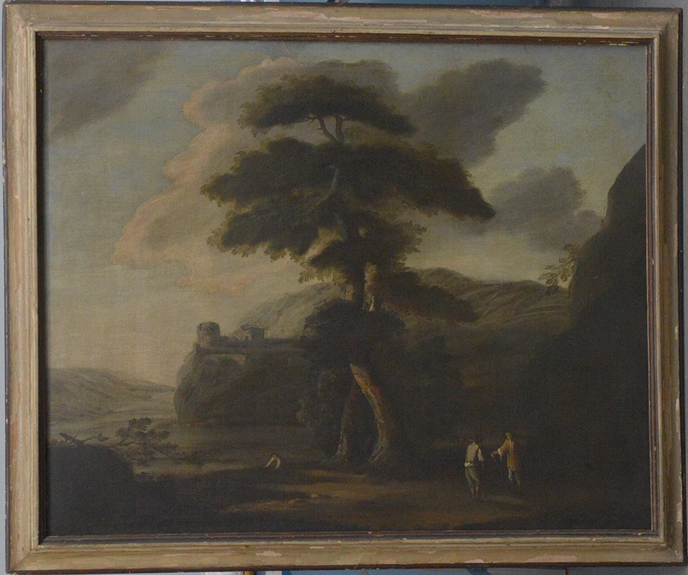 Scuola nordica del secolo XVIII, coppia di dipinti ad olio su tela raffiguranti "Paesaggio con barche" e Paesaggio" (cm 93x116) In cornice (difetti e restauri)