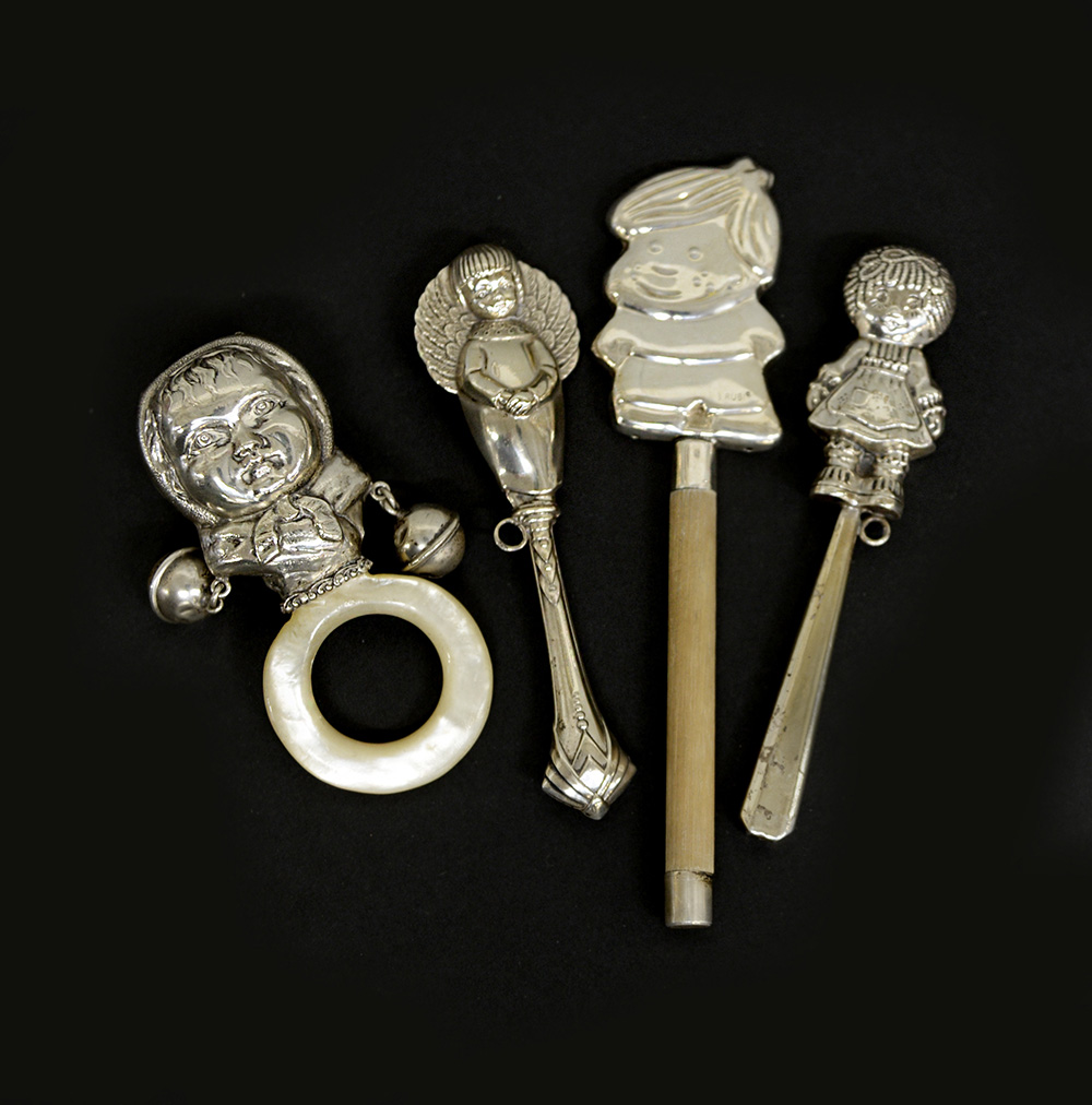 Gruppo di quattro sonagli in argento, legno e madreperla raffiguranti fanciulli e angelo (lievi difetti)