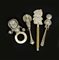 Gruppo di quattro sonagli in argento, legno e madreperla raffiguranti...