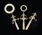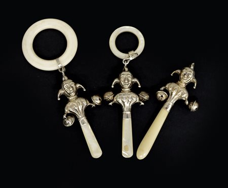 Gruppo di tre sonagli in argento, due con presa in madreperla, raffiguranti giullari. Punzoni inglesi, prima metà del secolo XX (difetti e mancanze)