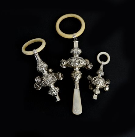 Tre sonagli in argento sbalzato decorati da pendagli, prese in osso e madreperla. Inizio secolo XX