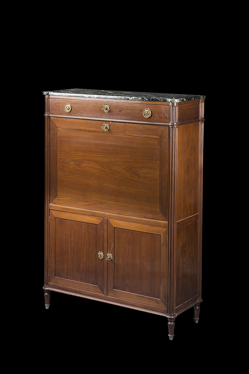 Secretaire lastronato in mogano. Parte superiore ad un cassetto e un'anta ribaltabile celante vani e cassetti. Parte inferiore a due ante. Montanti a colonne scanalate, applicazioni in bronzo dorato. Piano in marmo verde. Secolo XIX (cm 104x148x40) (difetti)