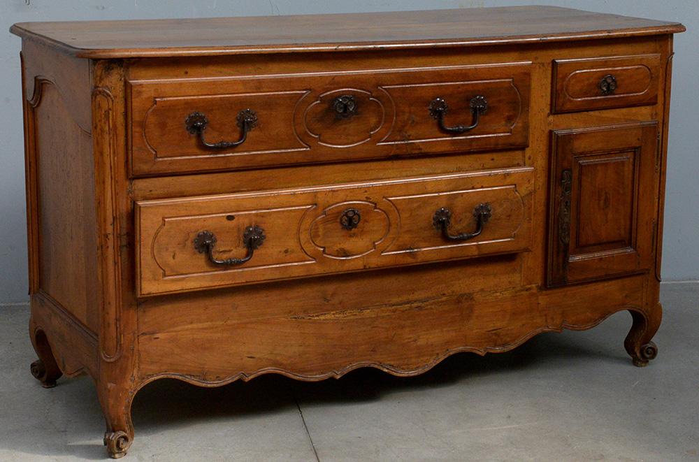 Credenza da centro in noce con fronte a due cassetti grandi, uno piccolo e un’anta. Grembiali e piedi sagomati. Francia - Provenza, secolo XVIII (cm 168x97x70) (difetti)