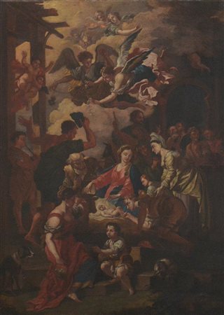 Scuola del secolo XVIII, "Natività" olio su tela (cm 130x92) (difetti e restauri)