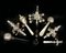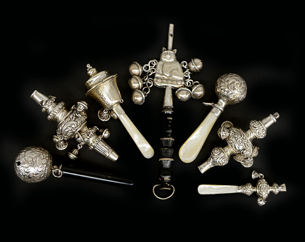Sette sonagli in argento sbalzato decorati da pendagli, prese in materiali vari di cui tre in madreperla. Epoche diverse (mancanze)