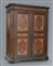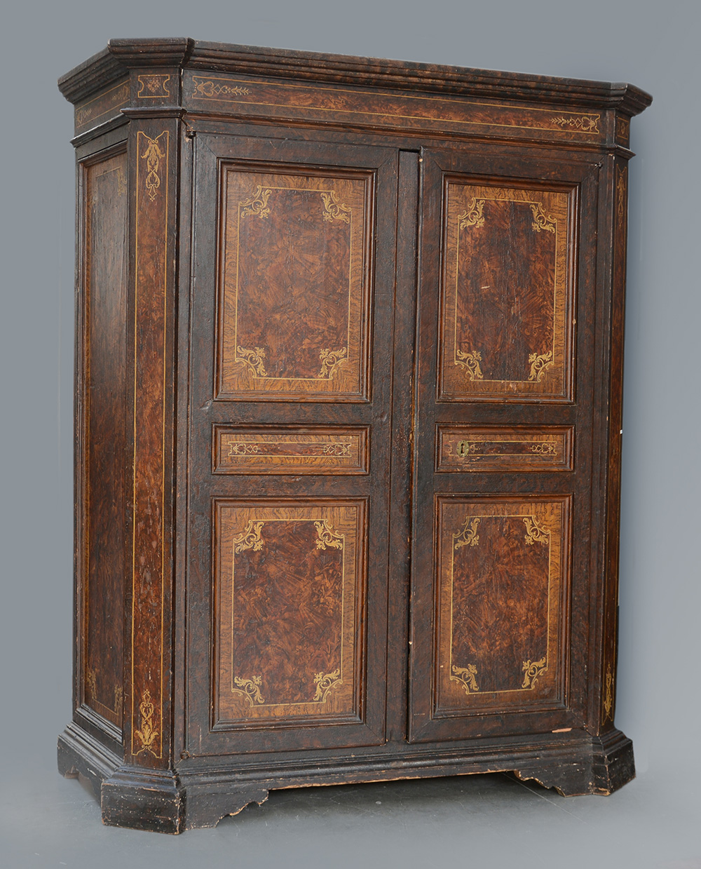 Armadio a due ante riquadrate in legno interamente laccato in policromia a finta radica con profili e fregi dorati, piedi a mensola, cappello aggettante. Sec. XVIII (cm 180x220x66) (difetti, restauri e sostituzioni)