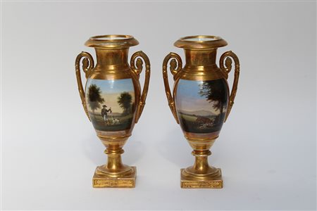 Manifattura del secolo XIX. Coppia di vasi in porcellana decorati in policromia a scene di caccia anse figurate (h cm 30) (difetti)