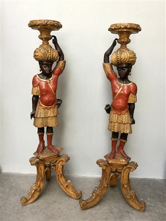 Arte del secolo XIX. Coppia di mori reggivaso in legno scolpito a tutto tondo e laccato in policromia (h cm 150) (difetti e mancanze)