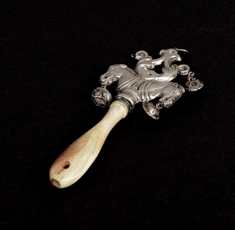 Sonaglio in argento decorato a teste di cavallo che sorreggono pendagli. Secolo XIX (mancanze)