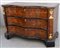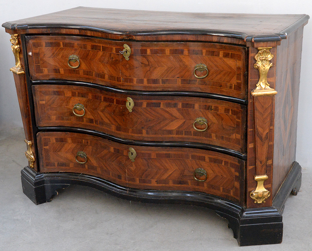 Comò a tre cassetti lastronato, filettato e con profili ebanizzati, fronte mossa e lesene angolari con elementi intagliati e dorati, piedi a mensola. Veneto, secolo XVIII (cm 143 x 97 x 73) (difetti e restauri)