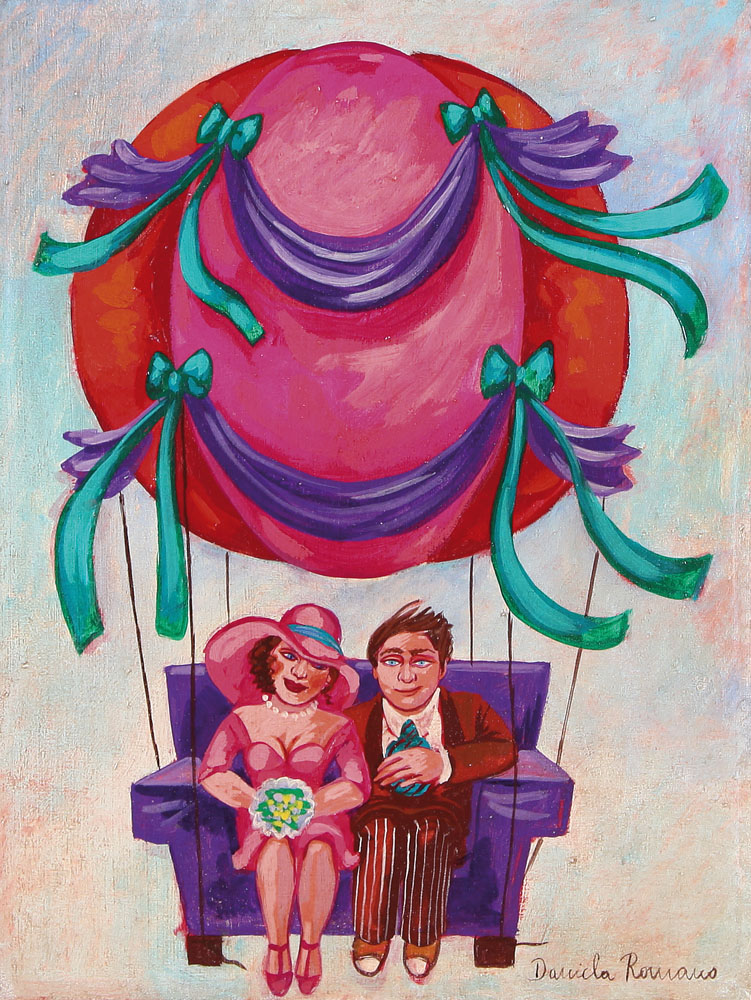 DANIELA ROMANO Napoli 27/11/1947 - Roma 27/06/2009 Personaggi in mongolfiera olio su tela cm. 40x30, firma in basso a destra, titolo e firma al retro, dichiarazione d'autenticità dell'artista su foto.