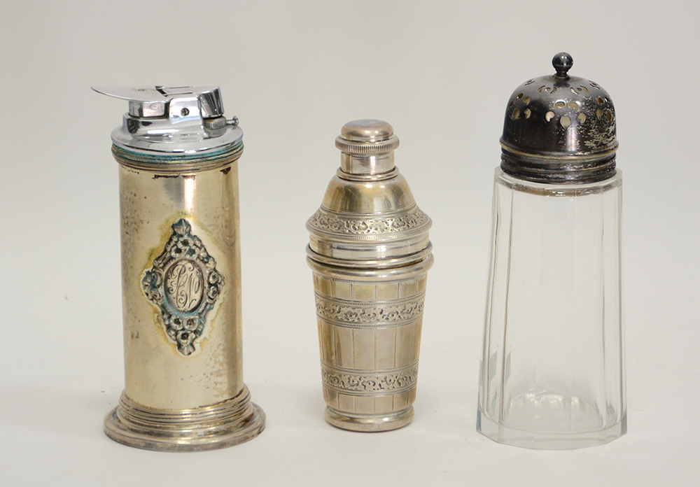 Lotto composto da un accendino da tavolo, uno spargizucchero ed una stoppiniera in argento, vetro e metallo (difetti)