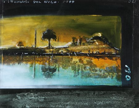 MIRKO PAGLIACCI Losanna 1959 Paesaggio sul Nilo, 1999 olio, tecnica mista e collage su tela cm. 35x45, titolo e anno in alto a sinistra, titolo, firma, anno e tecnica al retro, dichiarazione d'autenticità dell'artista su foto, opera registrata presso gli Archivi del Metropolismo come da dichiarazione su stampa fotografica allegata, certificato d'autenticità della Telemarket (BS) allegato.