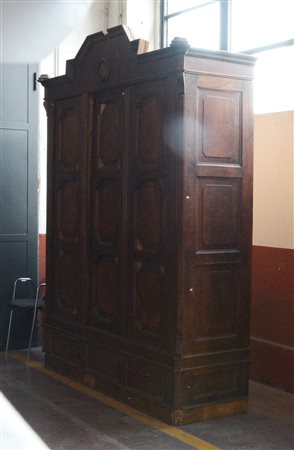 Armadio in noce a tre ante e fianchi riquadrati e pannellati, tre cassetti in linea nella base, montanti scanalati, cimasa sagomata, secolo XIX (cm 205x250x60) (difetti e mancanze)