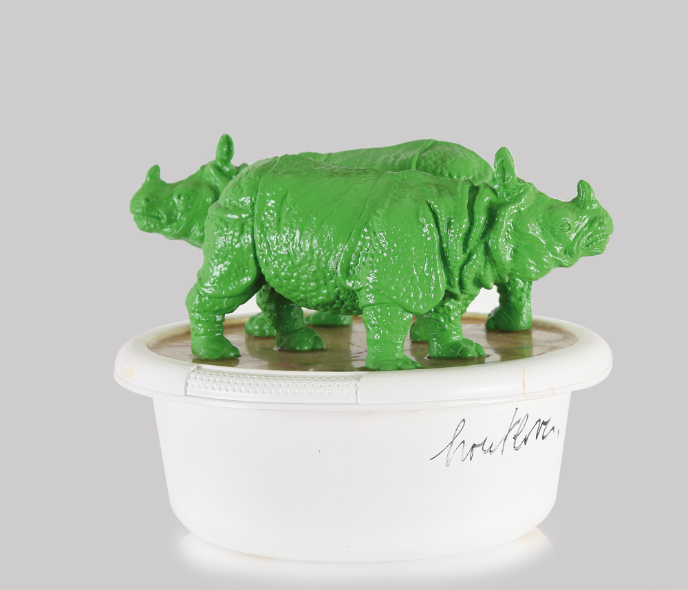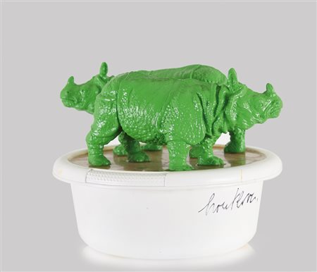WILLIAM SWEETLOVE Ostenda (Belgio) 1949 Three Cloned green rhinos, 2006 resina epossidica e plastica cm. 30x30x25, firma sul vaso, dichiarazione d'autenticità dell'artista su foto, pubblicato sul catalogo "Cracking Art Revolution", a cura di Piero Adorno, Claude Lorent e Francesco Santaniello, Edizioni Skira (MI), pagina 150.