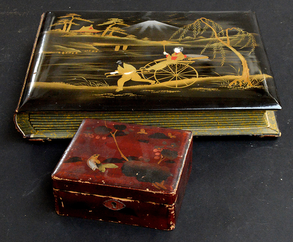 Lotto composto da album contenente dipinti a tema floreale e scatolina in lacca con vari decori (difetti) (misure diverse)