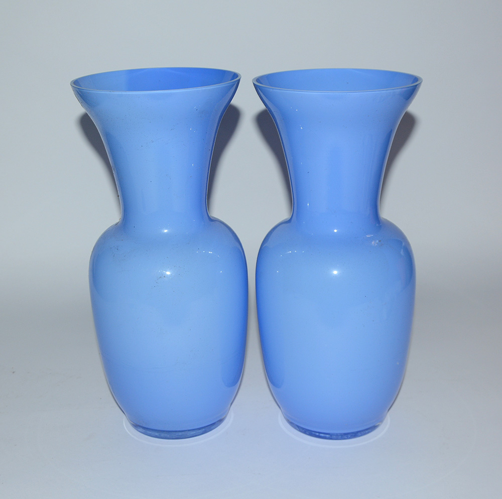 Lotto composto da due vasi a balaustra in vetro opacizzato celeste (h cm 35)