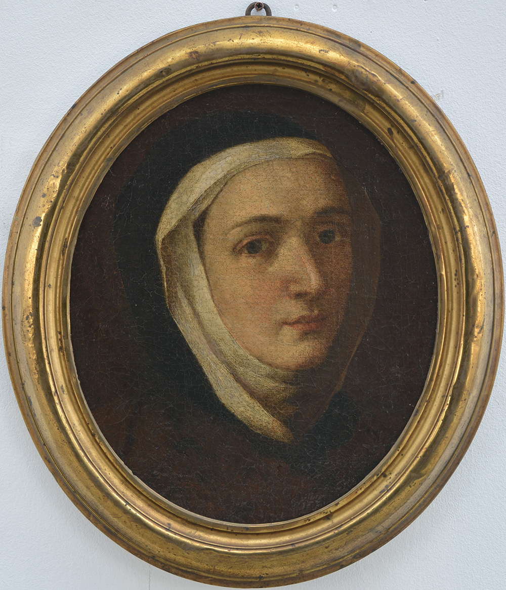 Scuola del secolo XVIII "Ritratto di santa" olio su tela ovale (cm 34,5x30) in cornice del secolo XVIII in lamiera (difetti e restauri)