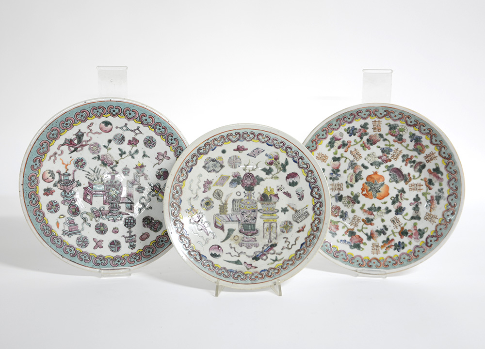 Lotto di tre piatti in porcellana Famiglia Rosa, due decorati con il tema dei cento oggetti antichi, uno con pesche e carattere beneaugurante del "doppio XI" (doppia felicità) (d. max cm 30) (difetti)