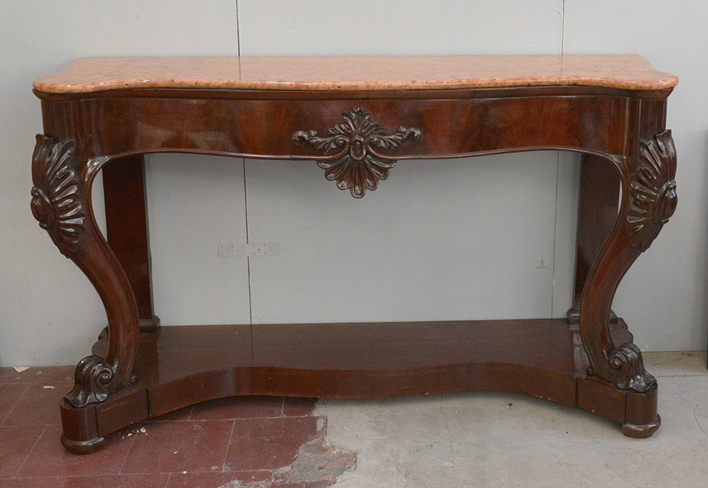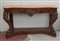 Consolle lastronata con fascia e gambe mosse intagliate a motivi stilizzati. Gambe poggianti su ripiano sagomato. Piano in marmo non pertinente (cm 156x95x50) Secolo XIX (difetti)