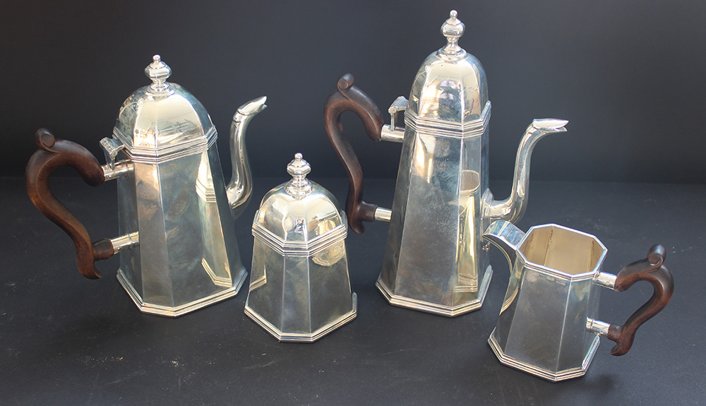 Servizio da té e caffè in argento di forma ottagonale, manici in legno sagomato. Argentiere Teghini, Firenze (g 2300 lordi ca.) (difetti)