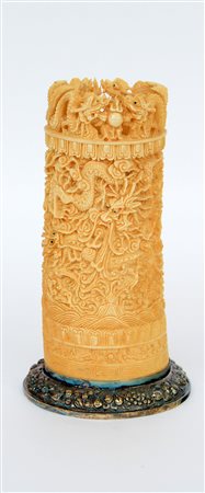 Portapennelli in avorio scolpito e traforato raffigurante draghi con base in argento (difetti)