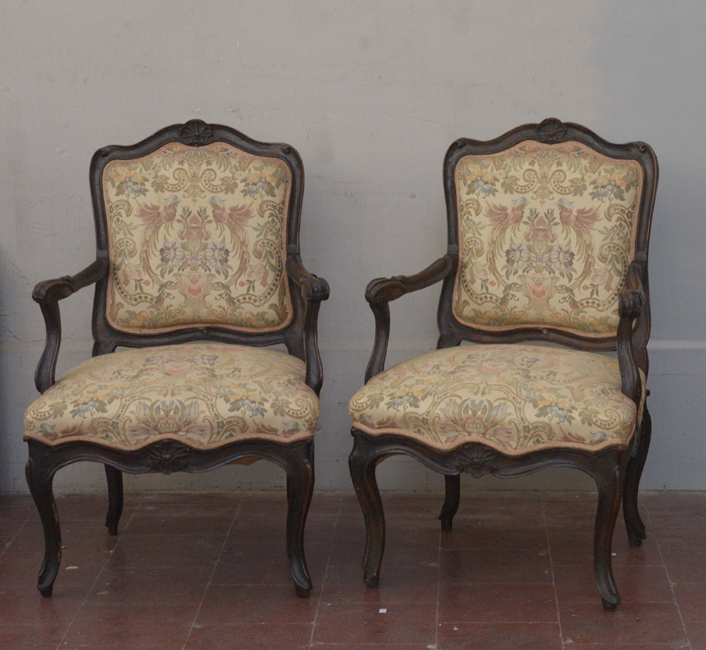Coppia di poltrone in legno intagliato a riccioli e valva di conchiglia. Gambe e braccioli sagomati. Secolo XVIII (difetti)