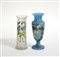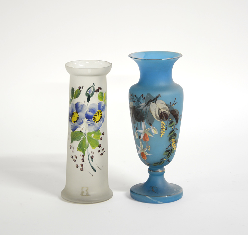 Lotto di due vasetti in vetro a decoro floreale, manifatture differenti (h. max cm 24) (difetti)