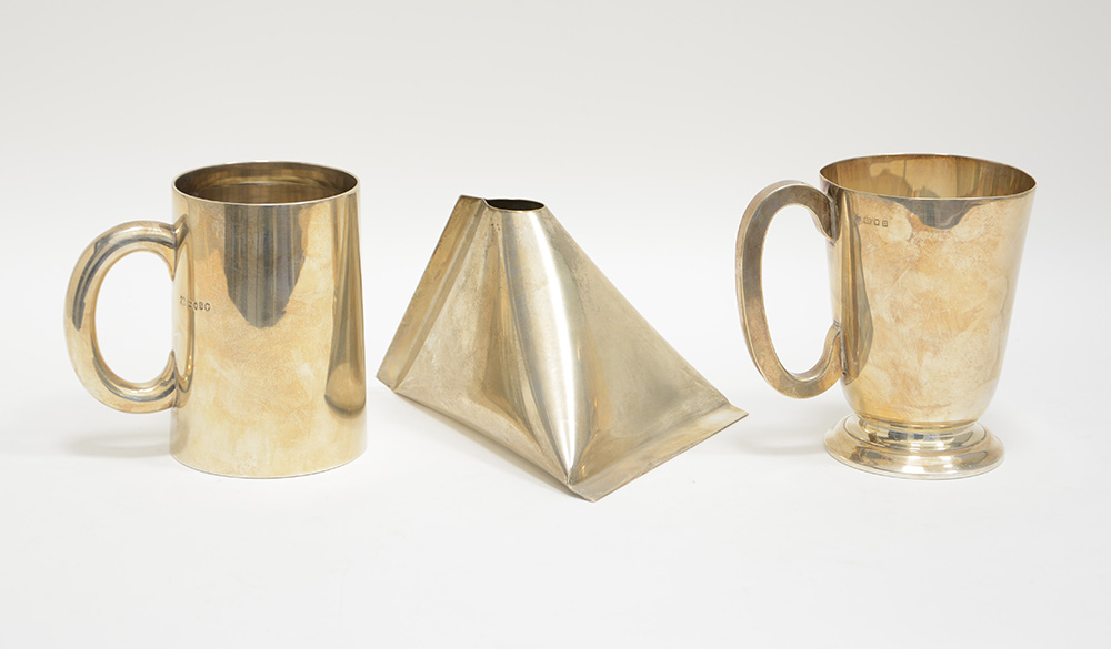 Lotto composto da un vaso di forma moderna in argento liscio e due boccali in argento con punzoni inglesi (gr. lordi 900) (difetti)