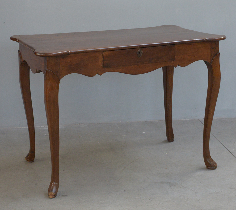 Tavolo scrittoio da centro in noce, cassetto nella fascia e gambe mosse....
