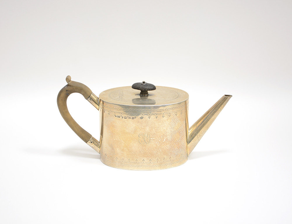 Teiera in argento con decori geometrici incisi, presa in legno. Marchi di Birningham, 1882 (g 450 lordi ca.) (difetti e restauri)