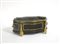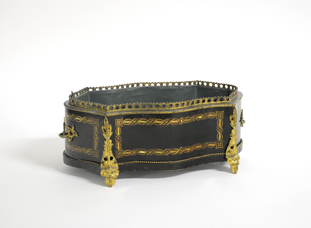 Fioriera di forma mossa in legno ebanizzato con intarsi geometrici in metallo e madreperla, guarnizione in metallo (cm 43x18x26) (difetti)